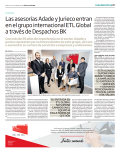 El Diario de Burgos se ha hecho eco de la noticia publicada esta mañana en relación a la integración de Adade y Juriego a nuestro grupo a través de Despachos BK. Con más de 35 años de experiencia en el sector, Adade y Jurieco apuestan por su futuro dentro de ETL GLOBAL, de cara a aumentar su cartera de servicios a empresas y autónomos.