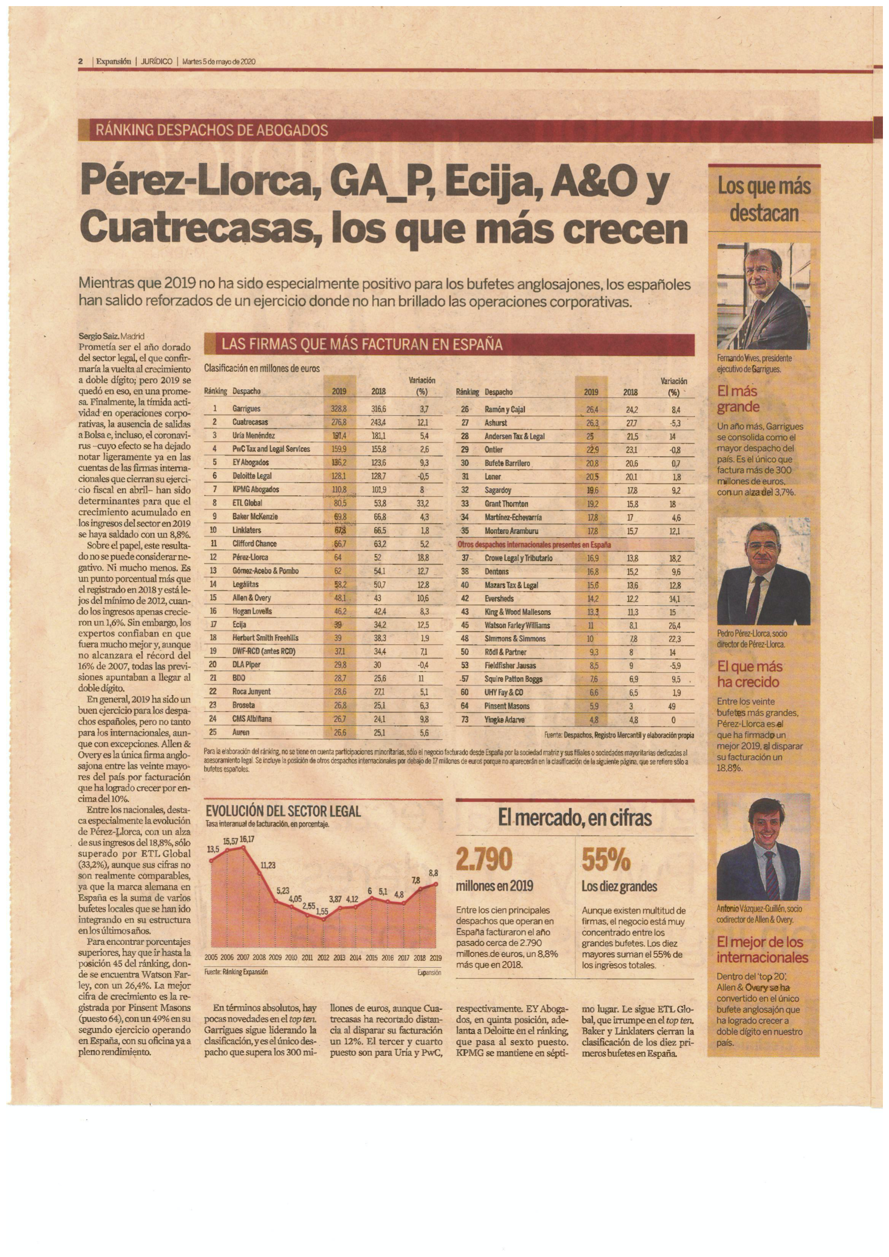 Como cada año, el diario Expansión ha publicado su Ránking Legal que sitúa a ETL Global en el top 10 ocupando el octavo lugar. La facturación del pasado año 2019 superó los 80 millones de euros, registrando un crecimiento superior al 33% , convirtiéndola en la firma que más crece con respecto al ejercicio anterior y consolidando su posición en el mercado español.